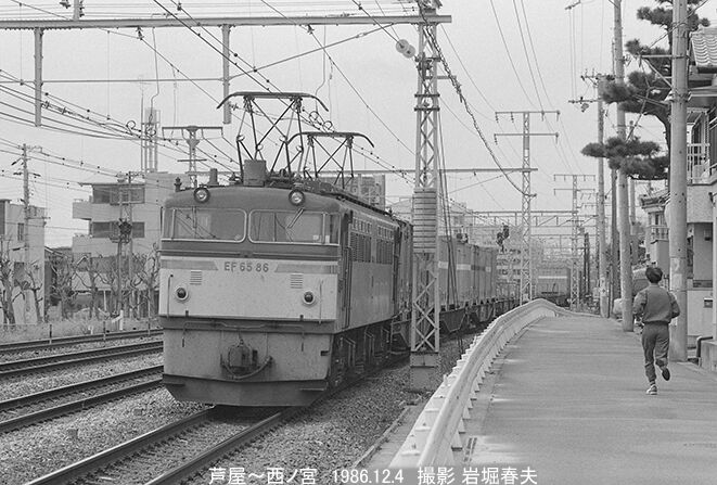EF6586[沼津]の牽く上り貨物が芦屋駅東方を走る。