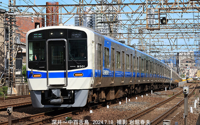地下鉄以外でも短時間で地上区間も撮っている。泉北高速に新車9300系が走っているが、中百舌鳥の踏切で撮影できた。以前は手前にパチンコ屋があったが、そこに高層ビルが建っていて、影が踏切にかかっていた。それでも影の手前でなんとか撮影できた。