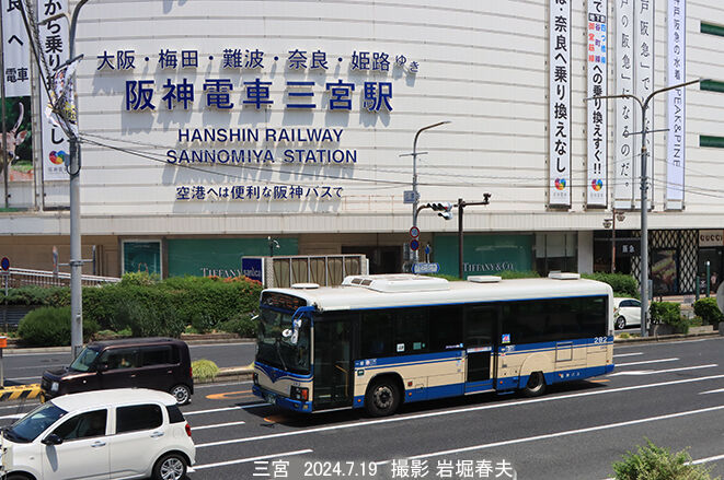 税関前始発の阪神バスが神戸三宮駅の上を走る。フラワーロードを通って、ここで右折し、行き先は阪神西宮駅である。西灘から先は国道線電車のルートを走る。