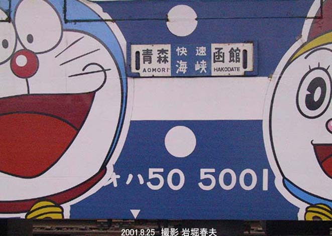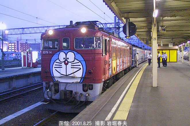 貼り忘れのカラー画像。夕暮れの函館駅で発車を待つ快速海峡ドラえもん海底列車。