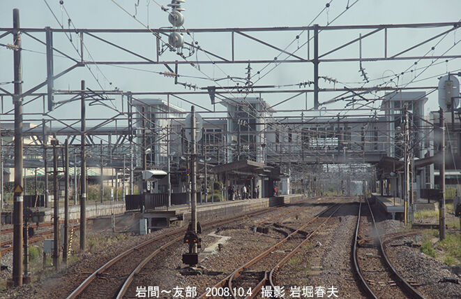 カーブの先に岩間駅がある。明治28年に日本鉄道の駅として開業。2面2線の配線で、2012年に橋上駅舎が完成した。