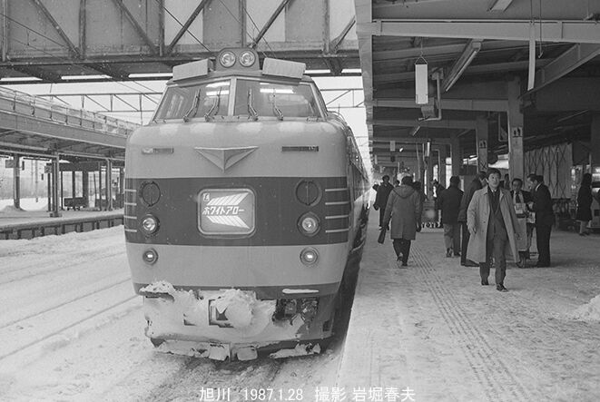 この日は上り「大雪」を滝川で降りて、キハ40に乗って旭川駅に戻ってきた。ここで「ホワイトアロー」に遭遇した。1986年3月に登場した速達特急で千歳空港行きになる。