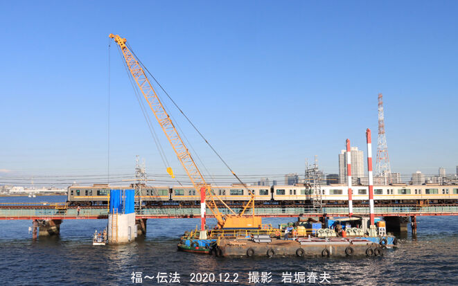 新しい橋脚が何本も建っている。しかし、本数がそろうにはまだ何年もかかりそうだ。小さなボートの上で作業していてかわいそうだった。