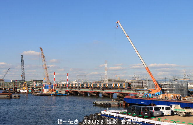 なんば線の淀川橋梁架け替え工事。水面からの高さが低いので、もう少し高い新橋梁に架け替える。工事の記録は二回目になるが、比べてもあまり進展は少ない。