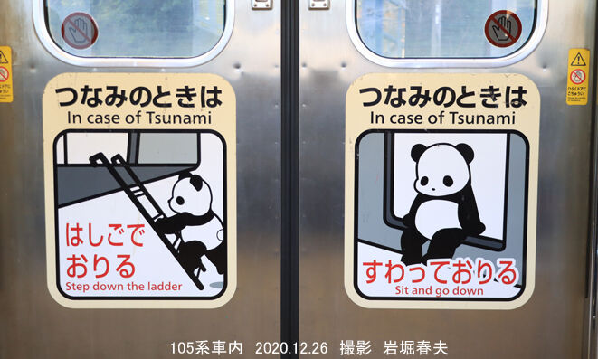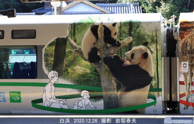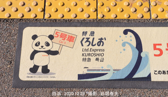 今回はまだ紀伊田辺~新宮間で105系電車が使われていて、乗車して写真を撮ってきた。この区間は津波の被害が予想されていて、その場合の電車の降り方もパンダのイラストで説明されていた。しかし、周参見駅で折り返したのだが、こちらはイノブタが有名である。今回は御坊で寄り道しなかったが、新しい紀伊田辺駅の駅舎を撮り、本数の少ない普通電車に乗って往復したので時間がかかり、帰りはパンダのラッピング「くろしお」で帰ってきた。白浜駅を発車するときは4人の駅員がパンダの旗を振って見送ってくれた。そのシーンは撮れていない。
