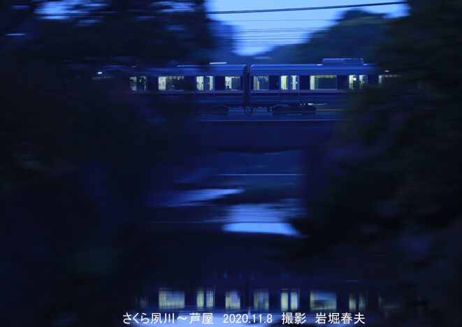 一番明るいレンズを装着。いつから使っていなかったか覚えていない。30年前にニューヨークで買ったレンズである。最初は夜明けを狙っていたが、夕方なら明るい時にセットして、だんだん暗くなってくるのがいい。川上から撮ると電車の接近がわからない。川下の橋からの方が接近がわかるし、電車の見える長さが大きい。水鏡は良くなかった。