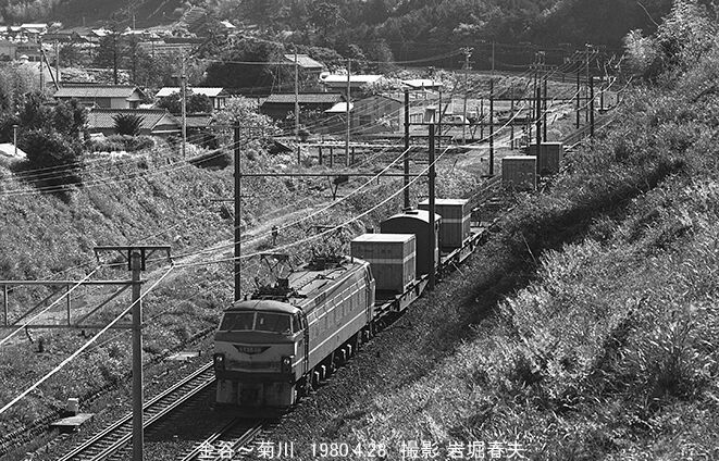 EF65537がひく下り貨物列車が大カーブを通過する。