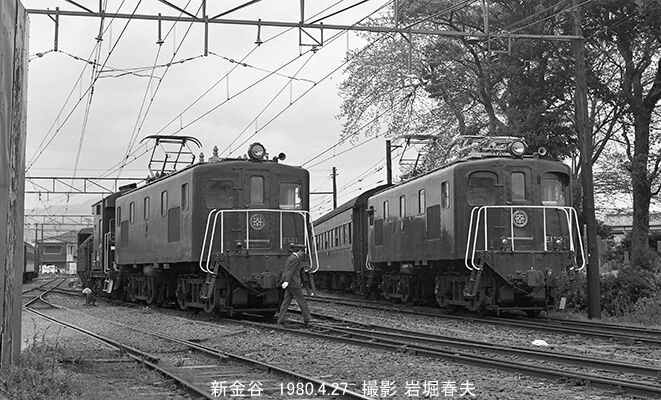 E101とE102が並ぶ。片や旅客列車である。