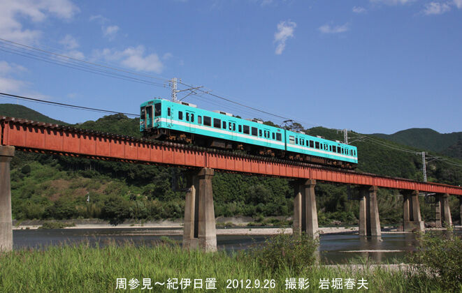 オーシャングリーンに白帯の105系が日置川を渡る。