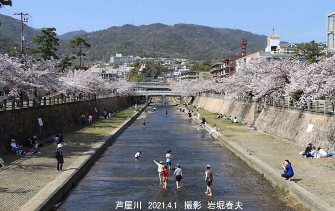 街の風景は何でも撮っておきたい。開放的な芦屋川の花見風景。